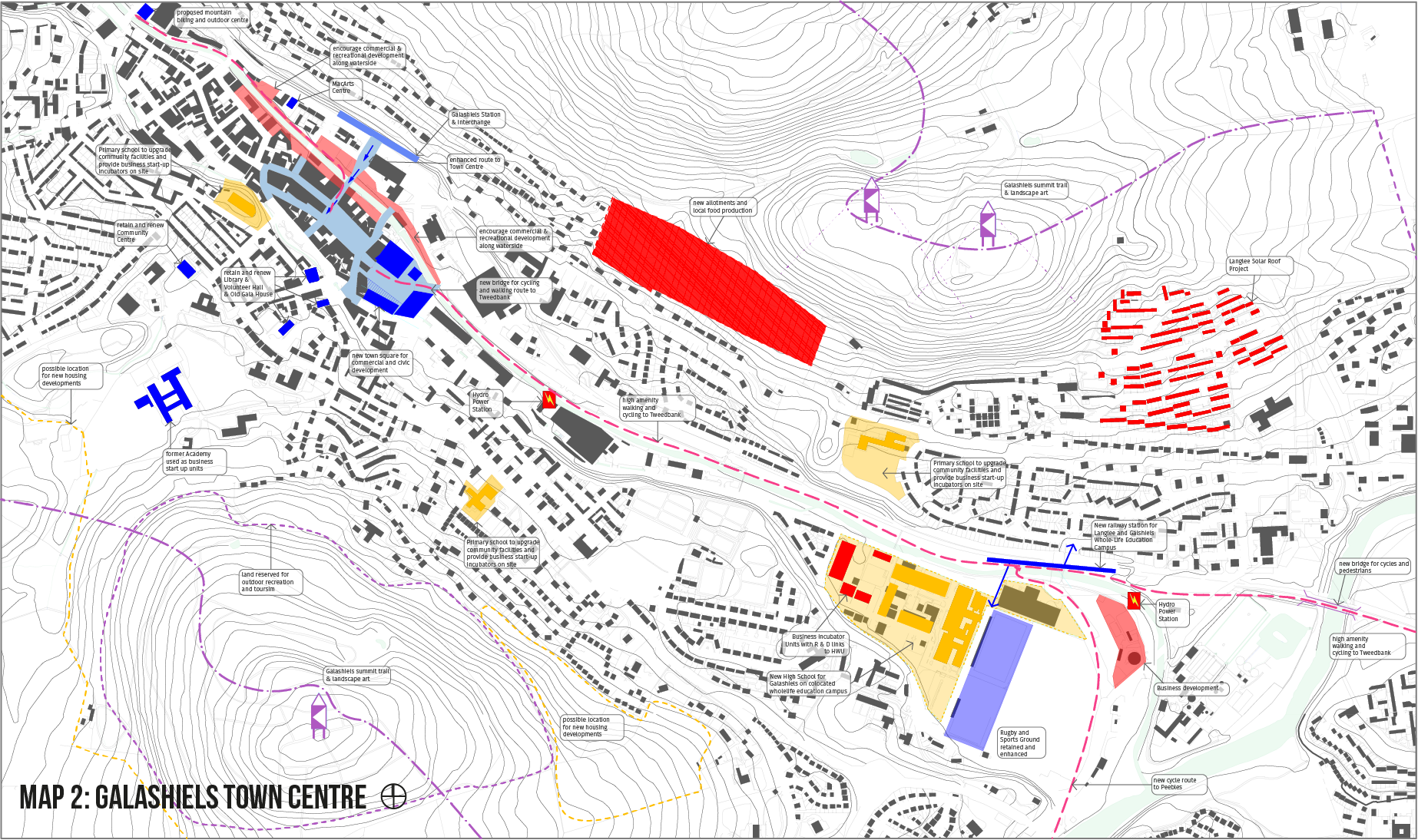 A combination of a strong textile heritage, and a compact town centre surrounded by a rich landscape means that new sustainable development compelling proposition. A transformed town centre acts as a starting point for recreational pursuits including a summit art trail and mountain biking routes served by a new centre. The workshops and the students were both unanimous that a new cycling and pedestrian route would transform the experience of travelling from the town centre west towards Tweedbank. A major proposition is a new railway station at Langlee to serve both the education campus and housing in that part of the town.
