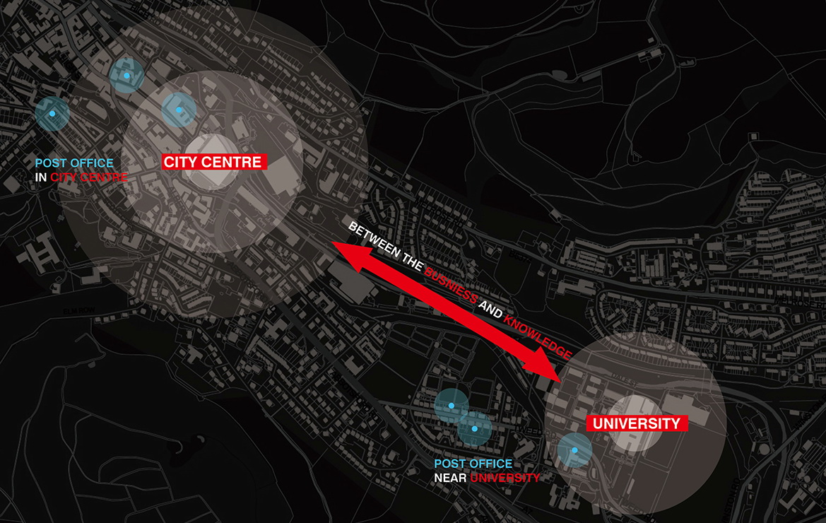 The project is aiming at the knowledge and business approach, so we look at the location between city centre and university area. These two areas could be the magnetic area in Galashiels, which support and drive the city direction (Figure 14). Both zones have post offices in the area.